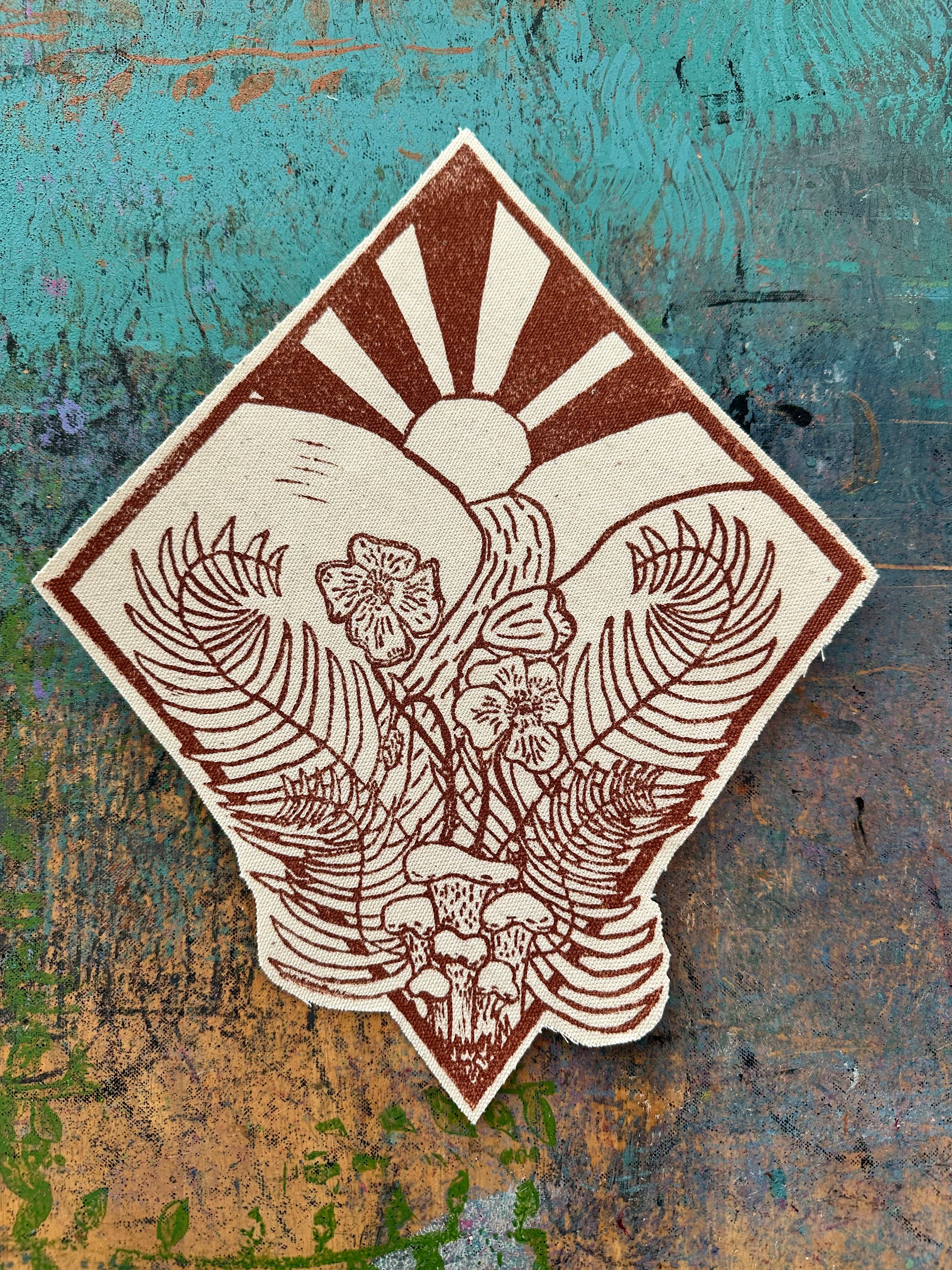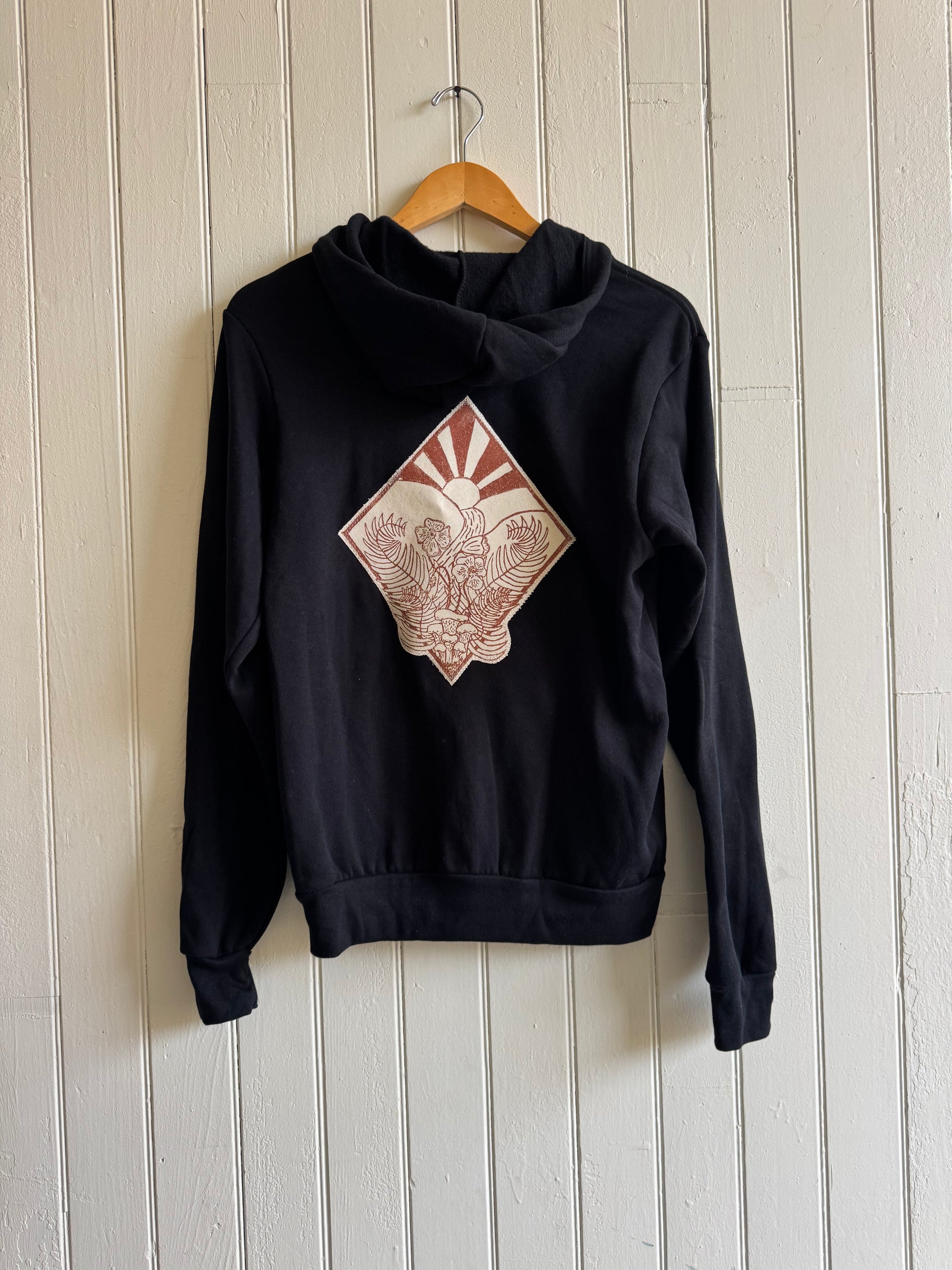 Journey graphic patch, in copper color way. All patches crafted with hand carved blockprints, slight color varriations do occur. Sewn on with Seapod logo patch at the left of the chest. Choose your patch colorway then pick your hoodie color with the contrast colored zip up front with white drawstrings at the hood. Kangaroo pouch pocket with ribbed cuffs and waistline. Ultra-soft cotton/poly heather blend. Machine wash cold/Tumble dry low. These are unisex sizing so best to size down unless you like your sweatshirts roomy. Seapod Humboldt front patch is available upon request.