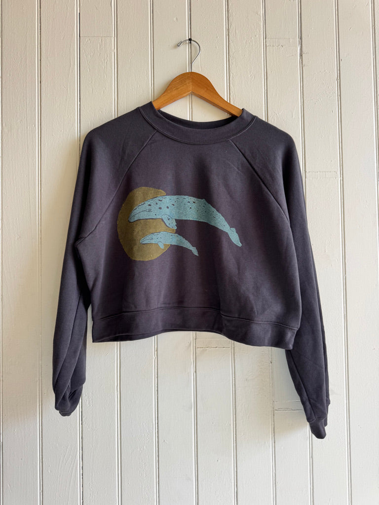 Womens Raglan crop sweatshirt with Mama and Baby Whale Print. Made of 52% Airlume combed and ring-spun cotton, 48% polyester fleece.