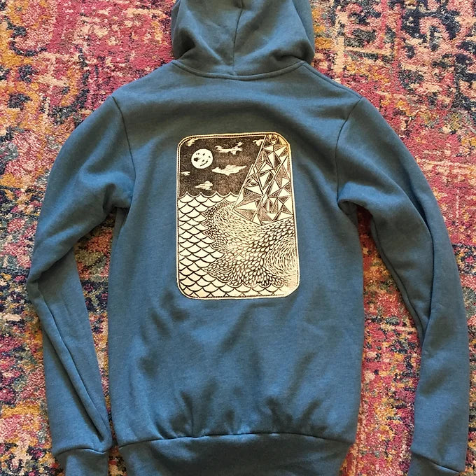 Seascape graphic patch, in black. All patches crafted with hand carved block prints. Sewn on with Seapod logo patch at the left of the chest. Choose your hoodie color with the contrast colored zip up front with white drawstrings at the hood. Kangaroo pouch pocket with ribbed cuffs and waistline. Ultra-soft cotton/poly heather blend. Machine wash cold/Tumble dry low. These are unisex sizing so best to size down unless you like your sweatshirts roomy. Seapod Humboldt front patch is available upon request.